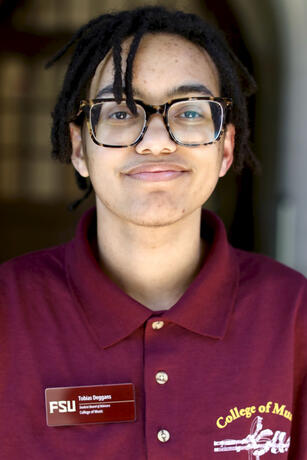 Tobias J. E. Deggans (b. 2004) is a Florida-based conductor, composer, vocalist, and multi-disciplinary artist. Drawing inspiration from contemporary choral music and experimental indie esoterica in equal measure, Tobias makes music that is innovative, playful, and emotionally resonant. His compositional work is centered on intentional text setting that spotlights underrepresented perspectives within the choral tradition.